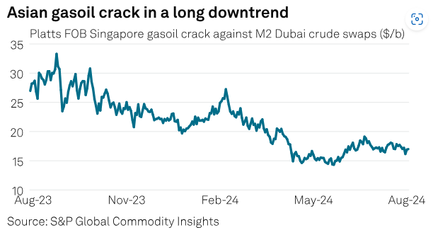 Platts, part of S&P Global Commodity Insights, assessed the second-month Singapore gasoil swap crack against Dubai crude swaps at an average of $16.77/b so far in third-quarter 2024, up from $16.53/b in Q2 but sharply below the average $22.12/b in Q1 and the 2023 average of $22.82/b.